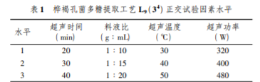 多糖提取率的影響 通過對比分析分別改變提取時間、超聲功率、提取溫度、 料液比條件下樺褐孔菌多糖類物質的提取率,結果分別顯示, 提取時間為 30 min、超聲功率為 320 W、提取溫度為 40 ℃、料 液比達到 1 g ∶ 15 mL 時,樺褐孔菌中的多糖提取量最大( 圖 1) 。因 此,選 擇 提 取 時 間 20 ~ 40 min 、超 聲 功 率 240 ~ 400 W、提取溫度 30 ~ 50 ℃、料液比 1 g ∶ ( 10 ~ 20) mL 為進一步優化。