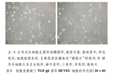 HUVEC 細胞內皮間質轉化過 程 10 μg·L - 1 TGF-β1 誘導 HUVEC 細胞 48 h 后, 顯微鏡下觀察細胞形態變化。