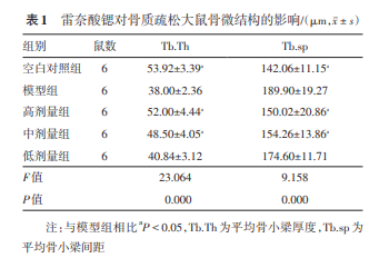 模型組與空白組相比,所有檢 測指標均差異有統(tǒng)計學意義(P<0.01),表明所選指 標,具有良好的指示作用。雷奈酸鍶高劑量組較模 型組大鼠血清IL?6、BALP、TRACP 5b、CTX?I均明顯 降低(P<0.05,P<0.05),OCN、25?HVD 明顯升高 (P<0.05)。