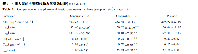 葛根素、聯(lián)合 α 組和聯(lián)合 β 組的大鼠體內(nèi)藥代動 力學(xué)過程均符合兩房室模型。聯(lián)合 α 組與葛根素組 比較,AUC、t1 /2α、t1 /2β和 Cmax均明顯增加,差異均有統(tǒng) 計學(xué)意義( 均 P < 0. 05) ; 聯(lián)合 β 組與葛根素組比較, AUC、t1 /2α、t1 /2β和 Cmax均明顯降低,差異均有統(tǒng)計學(xué)意 義( 均 P < 0. 05) 。結(jié)果見表 2。
