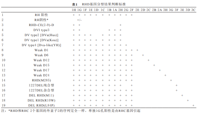 根據(jù)RH基因變異體基因分型檢測試 劑盒,在擴(kuò)增儀上進(jìn)行基因分型試驗。將將100μL dNTP-Buffer濃縮液、140μL去離子水 、2.0μL Taq 酶(5units/μL)和 2 5μL樣本DNA共267μL混合 液;向每個引物孔(1~24孔)各加入10μL上述混合 液。擴(kuò)增循環(huán)參數(shù):96℃ 2 min ,1 cycle ;96℃20 S/68℃60S ,5 cycles; 96℃20 S/65℃50S /72℃45 S,1 0 cycles;9 6℃2 0 S / 6 2℃5 0 S / 7 2℃4 5 S,2 5 cycles; 72℃2min,1 cycle。吸取5μL擴(kuò)增產(chǎn)物, 加入配制好的2%瓊脂糖凝膠中并進(jìn)行電泳,電泳參 數(shù)設(shè)置為電壓100V,時間15min。電泳后用凝膠成像 儀進(jìn)行拍照、記錄與分析。基因分型的結(jié)果判斷見表 1。