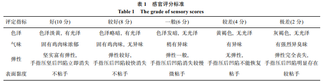 冷鮮雞的表觀狀態(tài)由 10 名專業(yè)人員評(píng)判, 評(píng)判標(biāo)準(zhǔn) 見表 1。從色澤、氣味、表面黏度和彈性 4 方面對(duì)冷鮮雞 進(jìn)行評(píng)分, 然后將 4 項(xiàng)分值相加, 10 人評(píng)判平均值為最終 試驗(yàn)結(jié)果, 最終得分 30 分以上表示一級(jí)新鮮, 20 分以上表 示二級(jí)新鮮, 8 分以下表示已經(jīng)完全腐敗, 不宜食用。